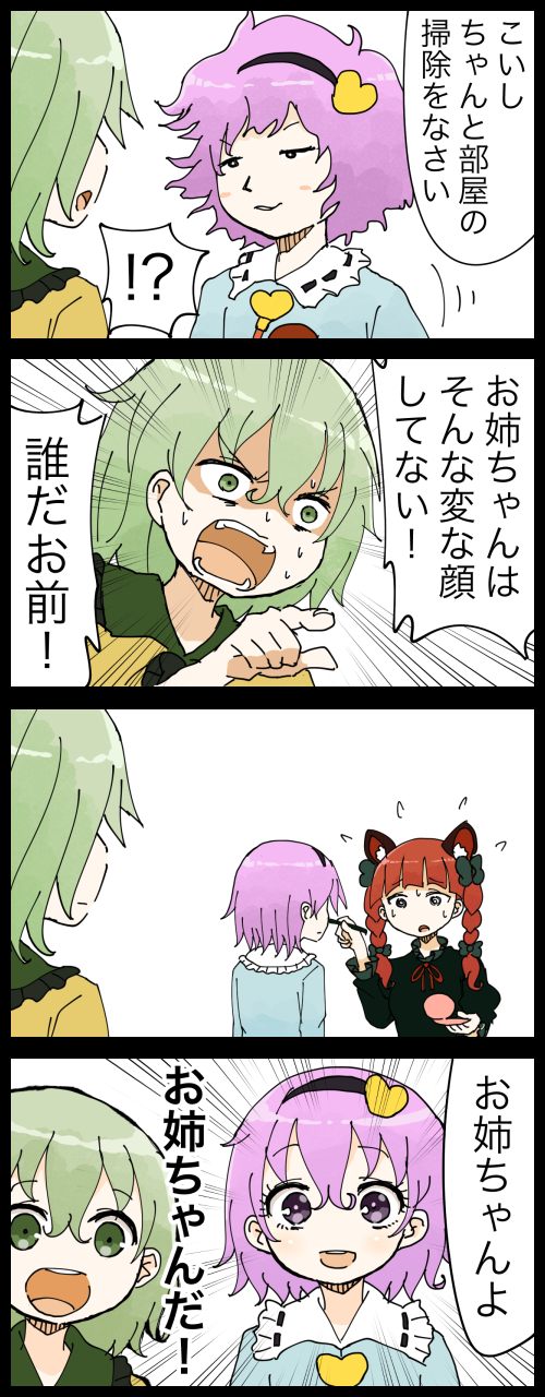| 無題 Name としあき 19/05/26(日)22:39:06 No.11716041 照れるお姉ちゃんも反応が薄いこいしちゃんもかわいいな… |
